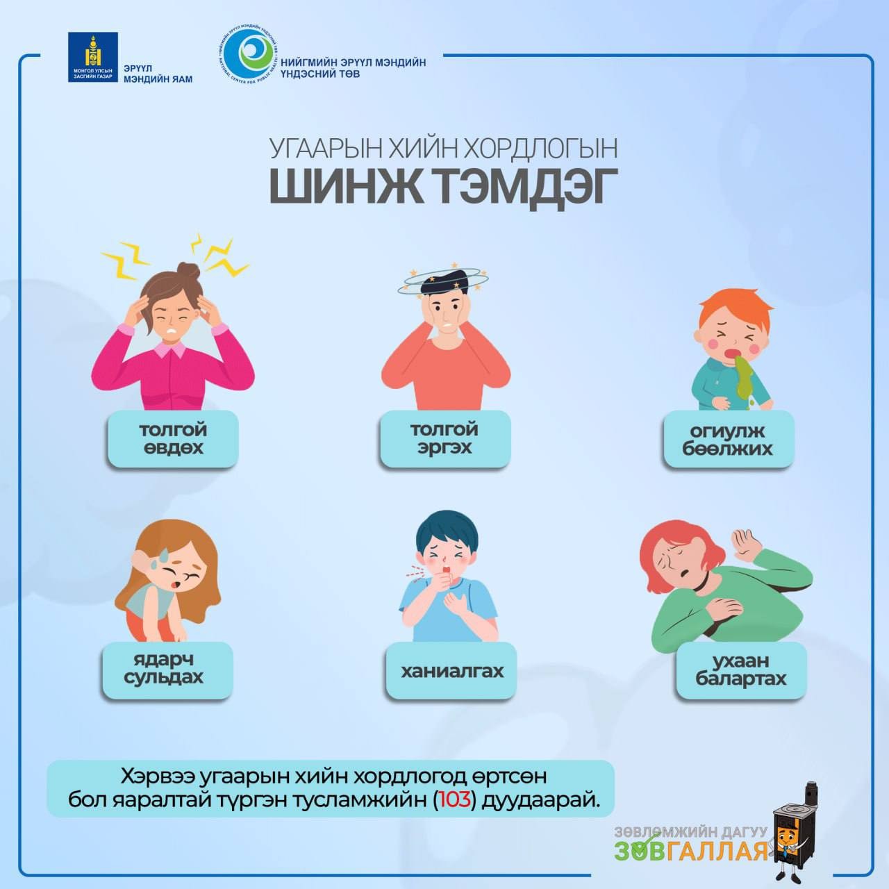 Нийгмийн эрүүл мэндийн үндэсний төвөөс угаарын хийн хордлогын өдөр тутмын тоон мэдээг гаргаж байна. Тус төвийн мэдээлснээр есдүгээр сар гарснаас хойш угаарын хийн хордлогын улмаас таван хүн нас баржээ. Тухайлбал, энэ сарын 23-ний өдөр НЭМҮТ-д угаарын хийн хордлогын улмаас эмнэлгийн тусламж үйлчилгээ авсан 81, нас барсан 3 тохиолдол бүртгэгджээ. Эдгээрийг байршлаар нь авч үзвэл СХД, ЧД, БЗД, СБД, ХУД-ийн нийт 31 өрхийн 81 иргэн угаарын хийн хордлогод өртөж эмнэлгийн тусламж үйлчилгээ авсан байна.