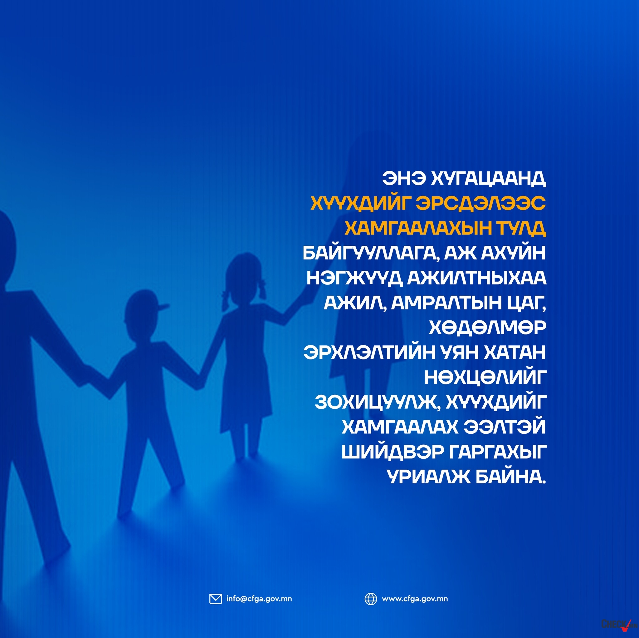 Хүүхэд бол гэр бүлийн баяр баясгалан, улс орны ирээдүй юм. Тиймээс хүүхэд бүрийг хамгаалах, аюулгүй орчинд өсөж хөгжих нөхцөлийг бүрдүүлэхэд хүн бүрийн оролцоо, хариуцлага чухал гэдгийг анхаарах нь зүйтэй байна.