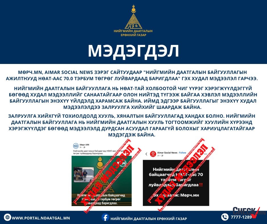 Уг мэдэгдэлд "Мөрч MN, Aimar Social News зэрэг сайтуудаар "Нийгмийн даатгалын байгууллагын ажилтнууд НӨАТ-аас 70.0 тэрбум төгрөг луйвардаад баригдлаа" гэх худал мэдээлэл гарчээ. Нийгмийн даатгалын байгууллага нь НӨАТ-тай холбоотой чиг үүрэг хэрэгжүүлдэггүй бөгөөд худал мэдээллийг санаатайгаар олон нийтэд түгээж байгаа хэвлэл мэдээллийн байгууллагын энэхүү үйлдэлд харамсаж байна. Иймд эдгээр байгууллагыг энэхүү худал мэдээлэлдээ залруулга хийхийг шаардаж байна.