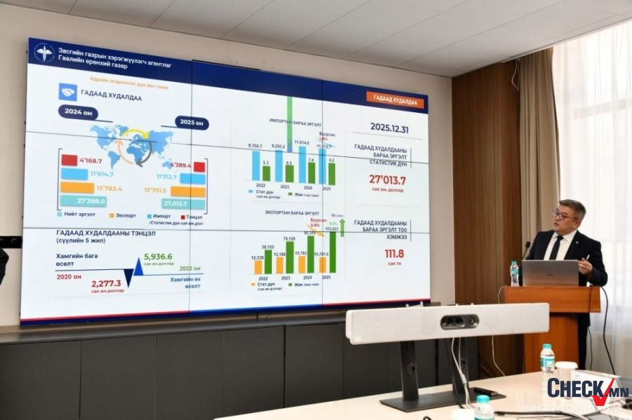 Улсын их хурлын чуулганы завсарласан хугацаанд Төсвийн байнгын хороо эрхлэх асуудалд нь хамаарах байгууллагуудын үйл ажиллагаатай танилцах хүрээнд өчигдөр Гаалийн ерөнхий газарт ажиллажээ. Тус газрын дэд дарга Г.Энхтайван 2025 онд гадаад худалдааны бараа эргэлт статистик дүнгээрээ 27 тэрбум ам.долларт хүрсэн. Үүнээс 15.7 тэрбумыг экспорт, 11.3 тэрбум ам.доллар нь импортынх байсан бөгөөд худалдааны тэнцэл 4.3 тэрбум ам.долларын эерэг дүнтэй гарчээ.