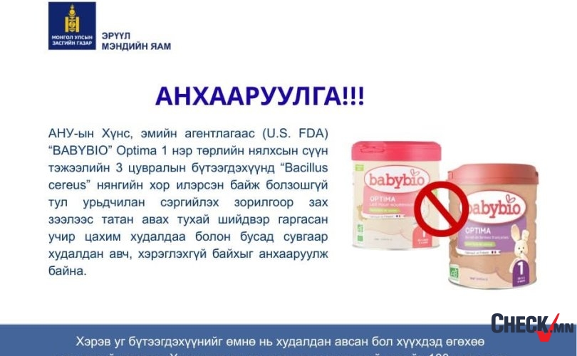АНУ-ын Хүнс, эмийн агентлагаас Франц Улсын “Vitagermine” компанийн “BABYBIO” брэндийн Optima 1 нэр төрлийн нялхсын сүүн тэжээлийн гурван цувралын бүтээгдэхүүнд “Bacillus cereus” нянгийн хор илэрсэн байж болзошгүйтэй холбогдуулан урьдчилан сэргийлэх зорилгоор зах зээлээс буцаан болон татан авах тухай шийдвэр гаргасан байна.
